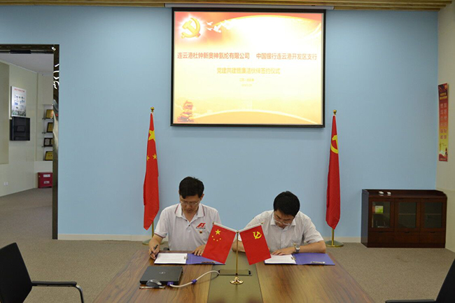 6月29日上午,杜鐘氨綸公司與中行連云港開發(fā)區(qū)支行舉行黨建共建及廉潔伙伴協(xié)議簽約儀式。儀式上,中行連云港開發(fā)區(qū)支行行長介紹了分行的基本情況、經(jīng)營管理情況、黨建和黨風廉政建設(shè)情況。