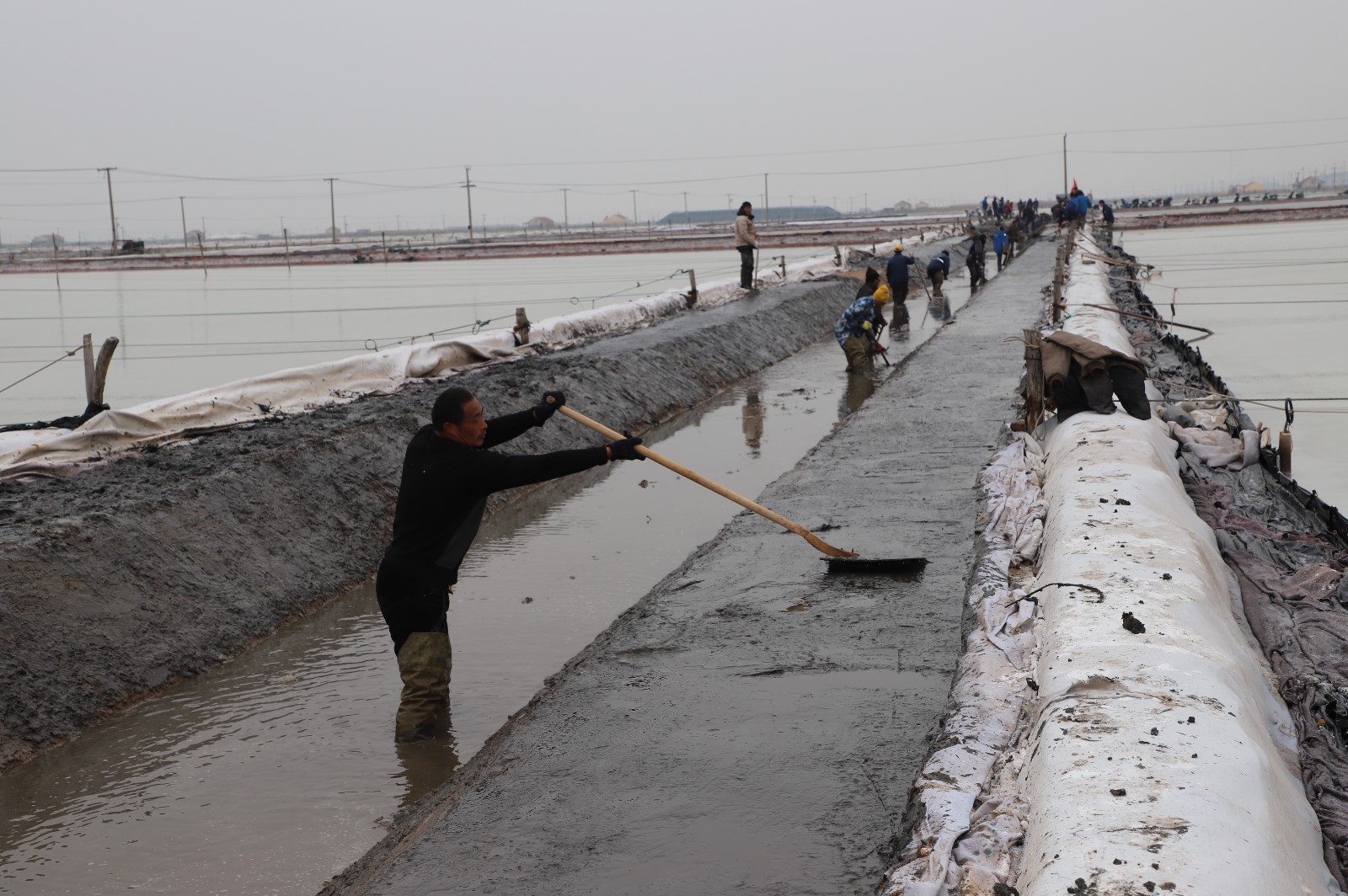 在新河制鹽分公司鹽田地頭的冬準(zhǔn)會(huì)戰(zhàn)現(xiàn)場(chǎng),人頭攢動(dòng),工人們正動(dòng)作嫻熟的進(jìn)行澆水、翻泥、踩實(shí)、做埝、整平……,鹽工們?nèi)?zhēng)先進(jìn)位,手腳不停的揮鍬挖泥,呈現(xiàn)出你追我趕、比肩發(fā)力的勞動(dòng)場(chǎng)景。一條條溝道改造、格堰修整等亮化灘場(chǎng)文明建設(shè)煥然一新,一幅幅“人勤春早”的美麗畫卷徐徐展開。