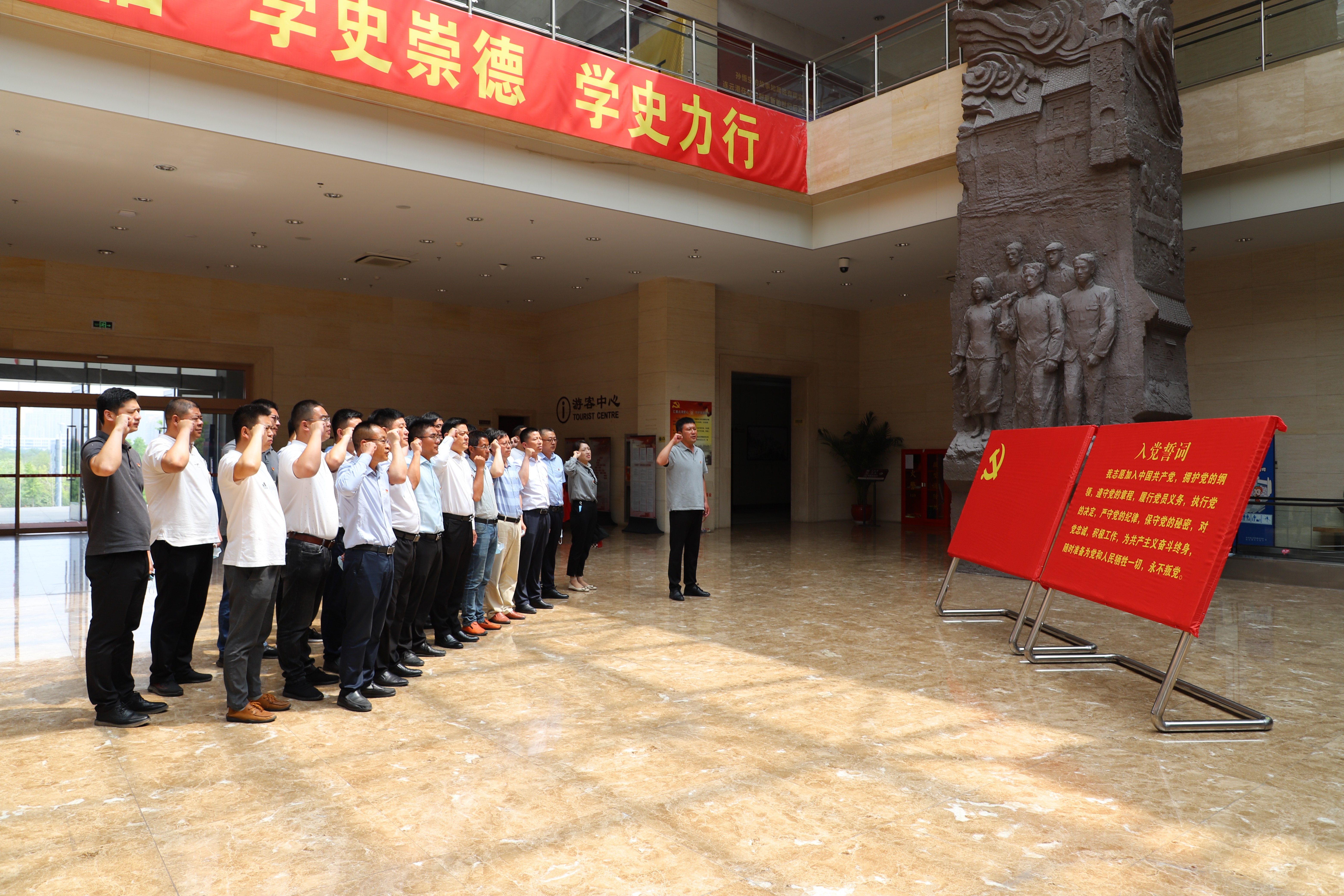在連云港市革命紀念館,大家在講解員引導(dǎo)下,依次參觀了五四運動時期展廳、土地革命時期展廳、抗日戰(zhàn)爭時期展廳。認真觀看館內(nèi)歷史圖片、影像資料、珍貴遺物,并在展館內(nèi)重溫入黨誓詞,感受港城人民保衛(wèi)家園、爭取解放、英勇奮戰(zhàn)的大無畏精神,把連云港從一窮二白、百廢待興走向欣欣向榮、繁榮富強的發(fā)展歷程。