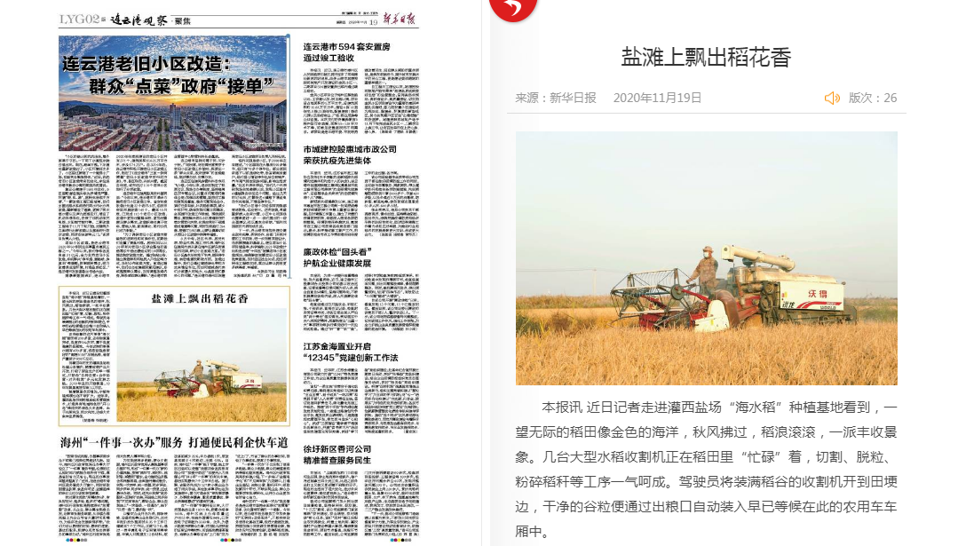 近日記者走進(jìn)灌西鹽場(chǎng)“海水稻”種植基地看到,一望無(wú)際的稻田像金色的海洋,秋風(fēng)拂過(guò),稻浪滾滾,一派豐收景象。幾臺(tái)大型水稻收割機(jī)正在稻田里“忙碌”著,切割、脫粒、粉碎稻稈等工序一氣呵成。駕駛員將裝滿稻谷的收割機(jī)開(kāi)到田埂邊,干凈的谷粒便通過(guò)出糧口自動(dòng)裝入早已等候在此的農(nóng)用車車廂中。