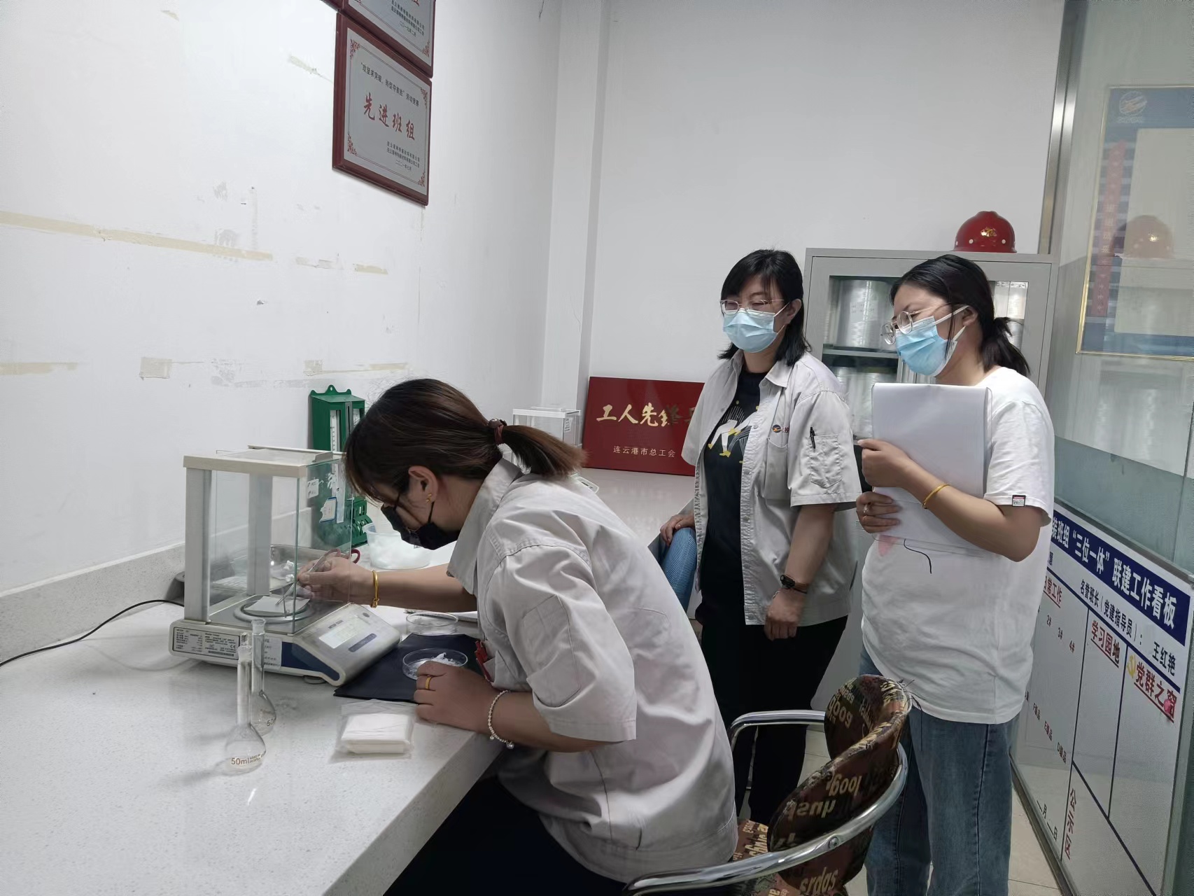 5月26日上午9點(diǎn),化驗(yàn)班組準(zhǔn)時(shí)開始比賽,選手們聚精會(huì)神的調(diào)整天平水平、置零、稱量蠟紙、置零、再稱量凍膠絲、放入容量瓶,一套操作如行云流水般一氣呵成。最終,吳珊珊同志在非常接近的比分中以2分53秒86險(xiǎn)勝!